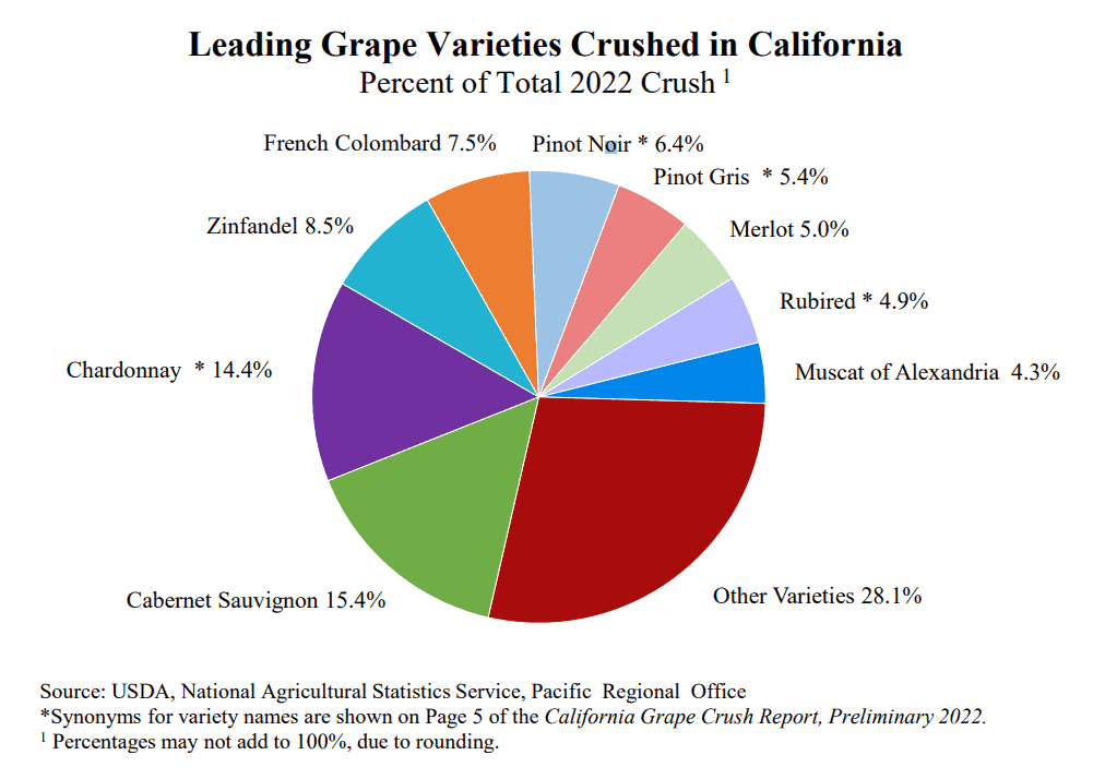 Em termos de volume de uvas prensadas, a California tem, a partir de 2022, uma nova variedade líder. Com cerca de 557 mil toneladas prensadas, que equivale a uma parcela de 15,4% do total, a Cabernet Sauvignon assumiu o primeiro lugar em termos de produção. Ela superou a Chardonnay, cuja parcela caiu para 14,4%, fruto de uma queda de 16% em relação a 2021.