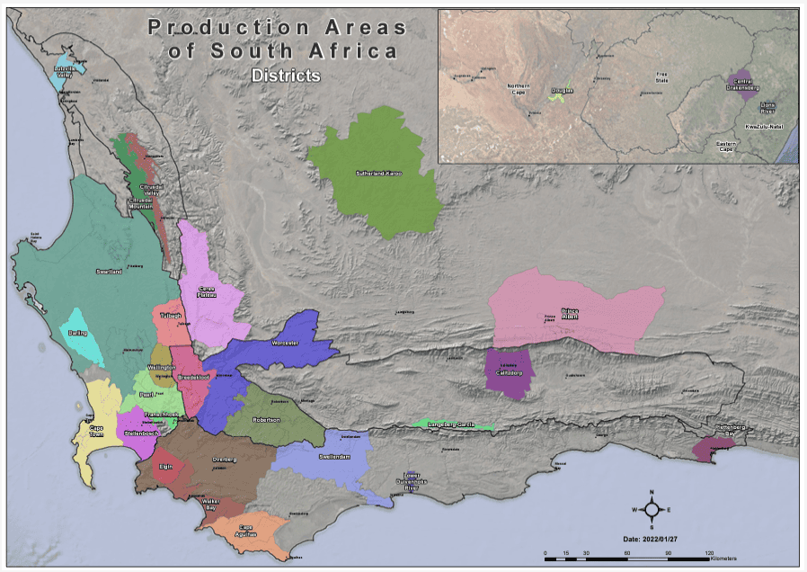 Atualmente a África do Sul conta com 30 distritos, 23 deles concentrados nas cinco regiões que compõem a unidade geográfica Western Cape, como mostra a tabela abaixo. Dos outros sete, três estão situados em Northern Cape, enquanto quatro outros não se situam em regiões demarcadas pelo Wine of Origin. Por exemplo, os distritos de Central Drakensberg e Lions River ficam na unidade geográfica Kwazulu-Natal, que não tem regiões demarcadas.