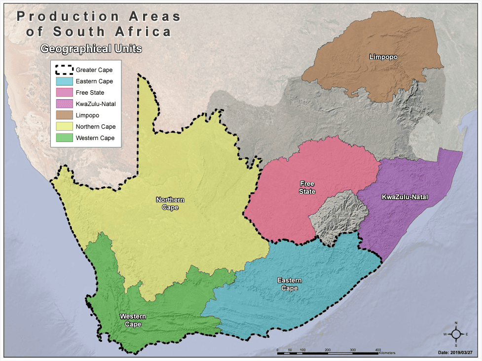 Atualmente existem seis unidades geográficas demarcadas na África do Sul, conforme mapa abaixo: Western Cape (onde fica a Cidade do Cabo), Northern Cape, Eastern Cape, Kwazulu-Natal, Limpopo e Free State. Por conta da grande extensão e pouca homogeneidade de terroir, são indicações geográficas mais genéricas. Elas incluem principalmente vinhos produzidos em áreas menos tradicionais ou que mesclam uvas de diferentes regiões, desde que dentro da mesma unidade geográfica.