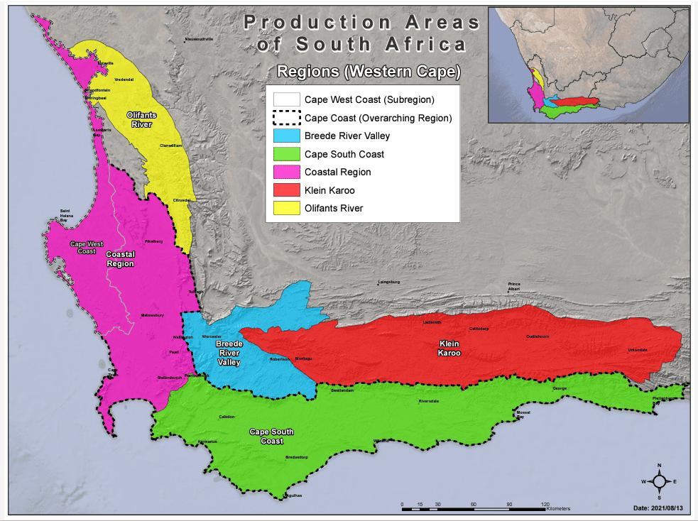 Em 2024, a África do Sul contava com seis regiões, cinco delas dentro da unidade geográfica Western Cape. São elas: Cape South Coast, Coastal Region, Breede River Valley, Klein Karoo e Olifants River. A única fora desta unidade geográfica, que responde pela vasta maioria da produção sul-africana de vinhos, é Karoo-Hoogland, que fica na unidade geográfica Northern Cape.