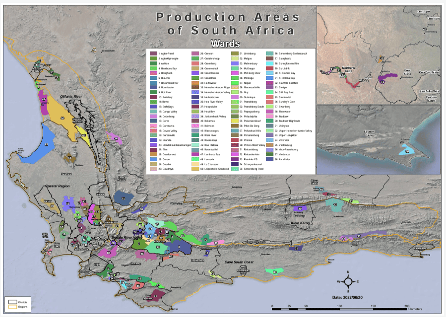 Em 2024, eram 101 wards, dos quais 32 na Coastal Region, 23 em Breede River Valley, 18 em Cape South Coast e 11 em Olifants River, totalizando 84 na unidade geográfica de Western Cape. Dos demais, sete se localizam em Northern Cape, um em Eastern Cape, um em Free State e oito sem unidade geográfica. Um exemplo famoso de ward é Constantia, que fica dentro do distrito de Cape Town e produz vinhos há mais de 400 anos.