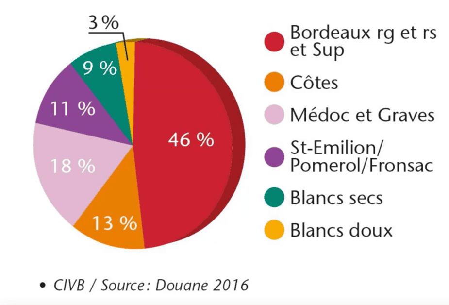 Como pode ser observado no gráfico abaixo, elaborado com dados de 2016 e fornecidos pelo CIVB, os vinhos doces representam 3% do volume produzido pela região de Bordeaux.