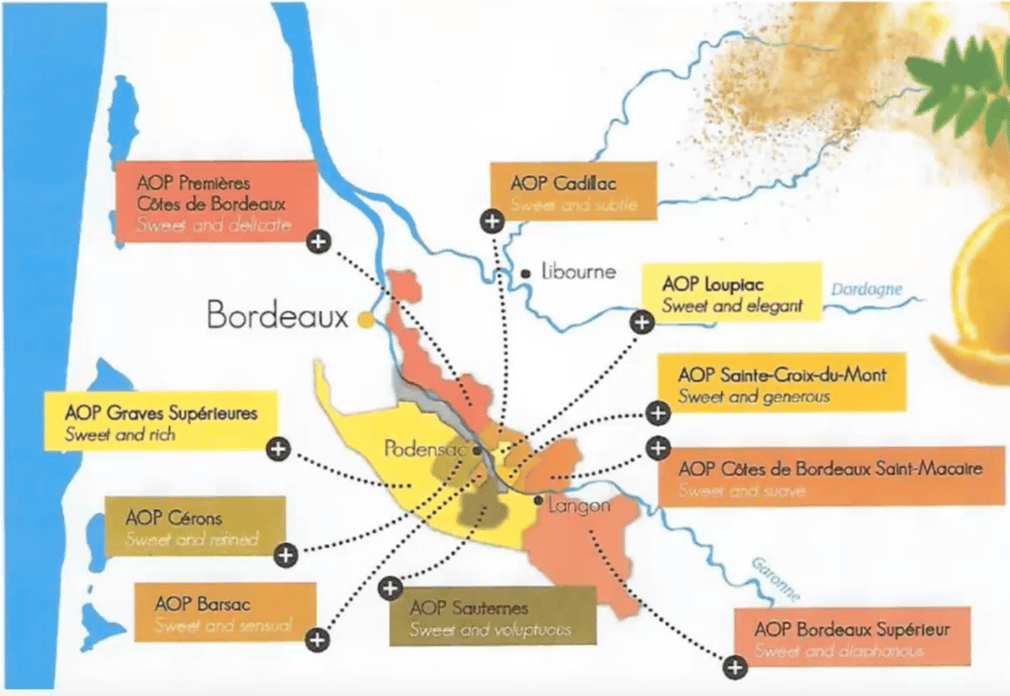 No mapa abaixo (fonte Wine Scholar Guild) são destacadas as 10 Apelações de Origens Controladas, em Bordeaux, que produzem vinhos doces. Poderíamos também incluir a AOC Monbazillac que apesar de muito próxima não pertence a Bordeaux, mas sim a uma outra região vinícola da França, Bergerac.