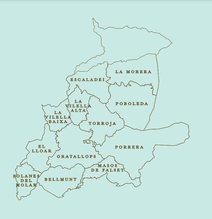 Criado em 2007, o conceito de vinho de vilarejo impõe restrições mais significativas. As uvas devem ser provenientes de vinhedos dentro das fronteiras de cada vilarejo, conforme definido pelo Consejo Regulador. No caso dos vinhos tintos, é obrigatório um mínimo de 60% Garnacha ou Carignan, elaborados a partir de vinhedos próprios ou em arrendamento por um período mínimo de sete anos.