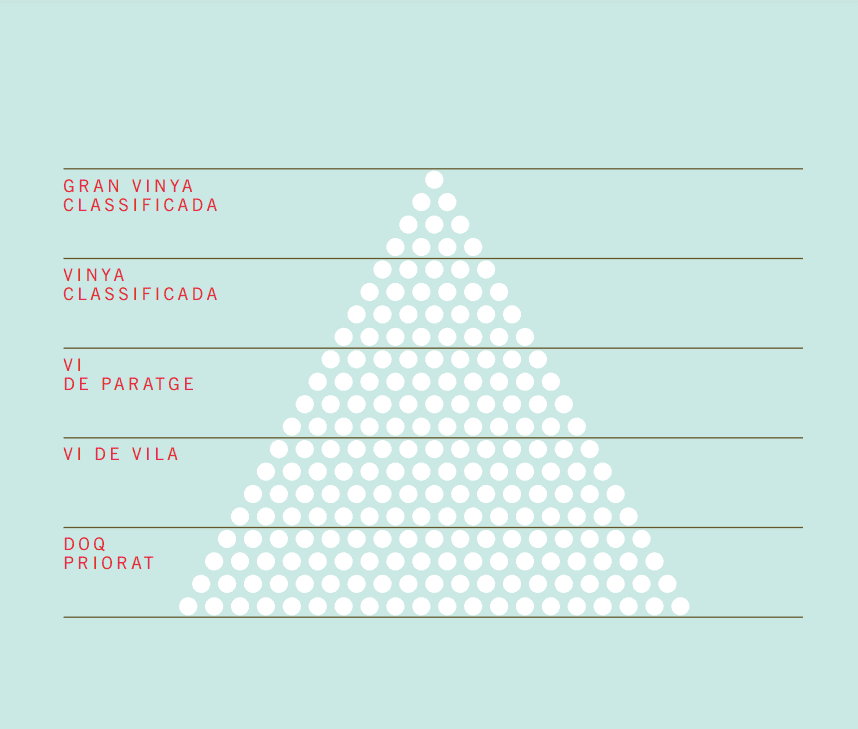 A forma mais fácil para entender a classificação dos vinhos do Priorat é compará-la com a classificação da Borgonha. Na base da pirâmide aparecem os vinhos regionais, que são produzidos com uvas cultivadas em qualquer área dentro dos limites da denominação e são rotulados como DOQ Priorat. O segundo degrau é chamado de Vi de Vila e, aprovado em 2007 (foi a primeira área na Espanha a implantar este conceito) corresponde aos Villages da Borgonha.