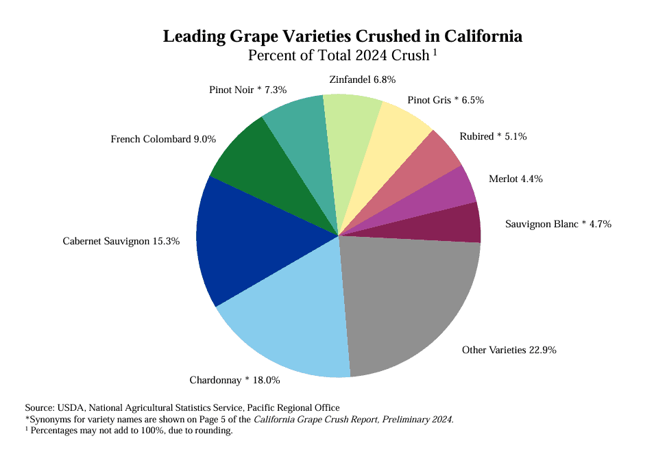 Como um todo, a prensagem de uvas na California foi a menor desde 2004, por conta de uma queda de 25% em relação aos patamares registrados em 2023. Já no caso das uvas tintas, 2024 teve o menor volume desde 1999, com uma queda anual de 27%. Apesar disso, o volume prensado de uvas tintas foi ainda cerca de 2% maior que aquele de uvas brancas. Porém, esta foi a menor margem nas últimas três décadas.