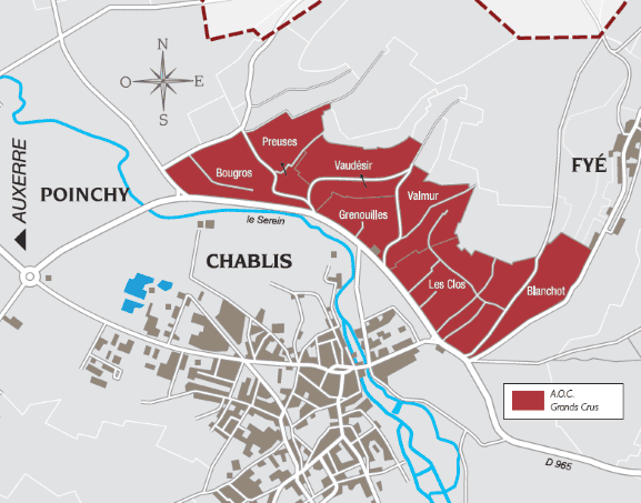 Porém, não há como apreciar os vinhos de Chablis sem conhecer os vinhos de sua denominação de maior distinção, o topo da pirâmide de qualidade da região: Chablis Grand Cru. Os sete climats que recebem esta classificação estão localizados em apenas uma encosta, na margem direta do rio Serein, a noroeste do vilarejo de Chablis.