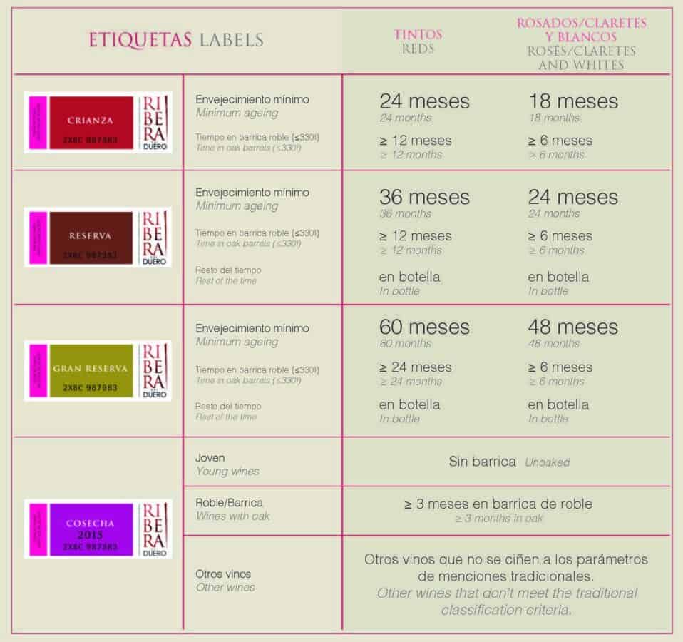 De acordo com as regras do Consejo Regulador da denominação de origem Ribera del Duero, existem quatro classificações distintas: Cosecha, Crianza, Reserva e Gran Reserva. Abaixo, vamos conhecer cada uma delas, lembrando que as barricas usadas para o envelhecimento devem, obrigatoriamente, ter no máximo 330 litros de capacidade.