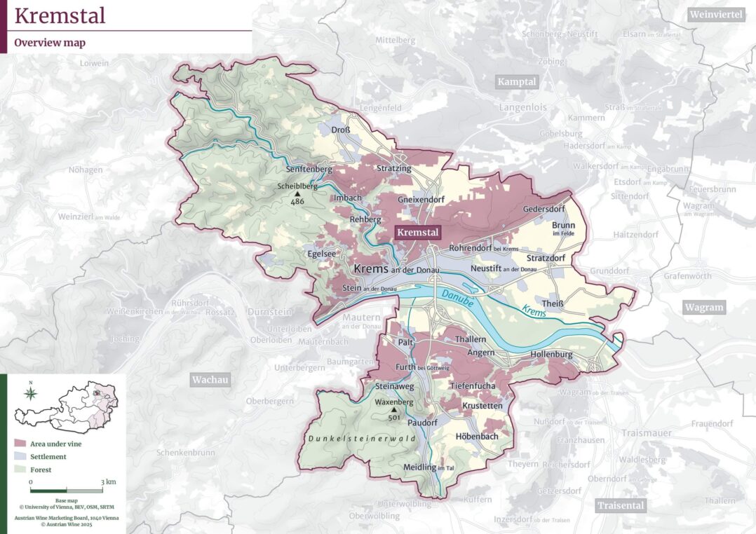Localizada imediatamente a leste da Wachau, Kremstal se organiza em torno da cidade histórica de Krems an der Donau e das encostas que acompanham o curso médio do rio Danúbio. Menos dramática em termos de relevo do que a Wachau, mas mais diversa e aberta do que Kamptal, a região ocupa uma posição de transição tanto geográfica quanto estilística, o que se reflete diretamente no perfil de seus vinhos.