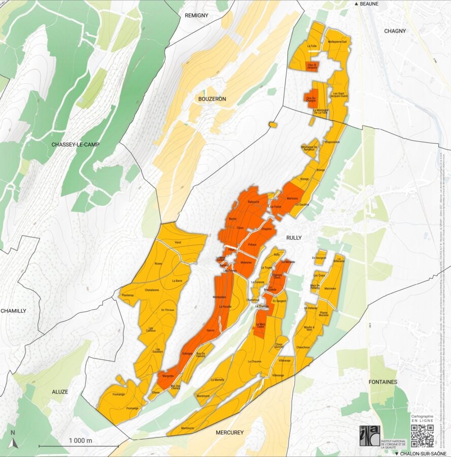 No total, são 69 climats distintos, 46 dos quais classificados como Village e 23 como Premier Cru. Seus vinhedos Premier Cru (em laranja brilhante no mapa abaixo), à exceção de dois climats situados mais a norte, próximo a Chagny, ficam nas encostas a sudoeste do vilarejo de Rully e podem ser divididos em dois blocos distintos. Próximos ao vilarejo e em menor altitude, estão localizados vinhedos como Cloux, Rabourcé, Raclot, Pillot e Meix Caillet. Eles dão origem a vinhos com mais corpo, intensidade e textura, com destaque para os brancos, mas também com produção de tintos.