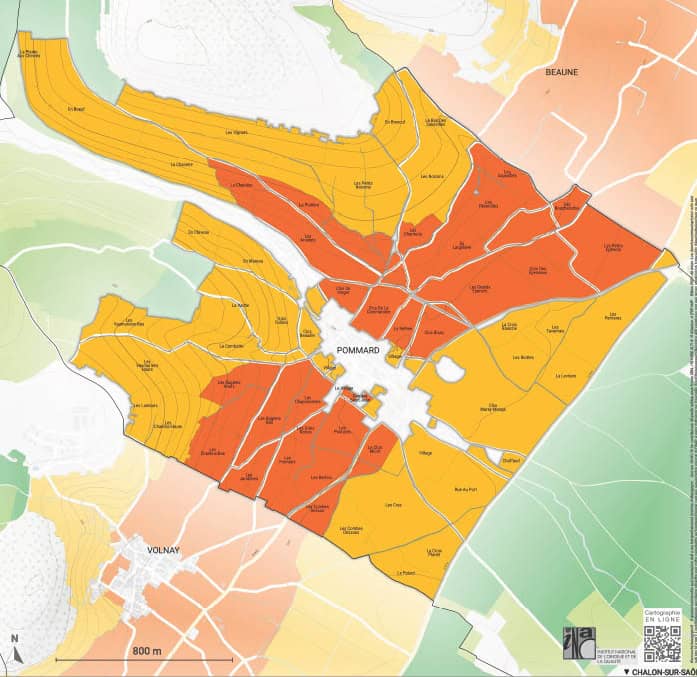 Como em praticamente toda a Côte d’Or, os melhores vinhedos ocupam a parte intermediária das encostas, com os climats village ficando com as partes mais baixas e mais altas. Em Pommard, curiosamente, porém, a área de vinhedos village na parte mais alta é superior a mais baixa, algo raro na Côte d’Or.