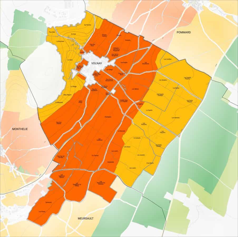 Apesar de não possuir vinhedos classificados como Grand Cru, Volnay tem alguns dos melhores vinhedos Premier Cru da Côte de Beaune. Climats como Clos de Duc, Clos de la Bousse d’Or e Clos du Château des Ducs chamem a atenção pela qualidade de seus vinhos. Porém, são os vinhedos concentrados ao sul do vilarejo, na parte média da colina, que ganham maior destaque.