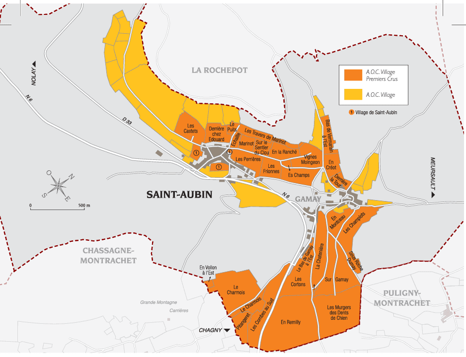 Além do vilarejo de Saint-Aubin, a área desta denominação de origem inclui também a aldeia de Gamay, que deu origem ao nome da uva que ainda é cultivada em algumas regiões da Borgonha, mas que ganha mais destaque no Beaujolais. Curiosamente, porém, a imensa maioria dos vinhedos da aldeia de Gamay tem na Chardonnay seu foco principal.