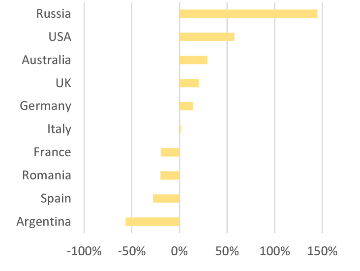 Três casos merecem destaque especial. Na França, o consumo de vinhos brancos caiu 20% entre 2000 e 2021, bem menos que a queda de 49% nos tintos. Já a Rússia foi o país com maior crescimento no consumo de vinhos brancos neste período (+145%), enquanto a Argentina viu o interesse nestes vinhos cair mais do que pela metade em apenas 21 anos. Com isso, a fatia dos vinhos brancos no consumo total argentino caiu de 46% para 26%.