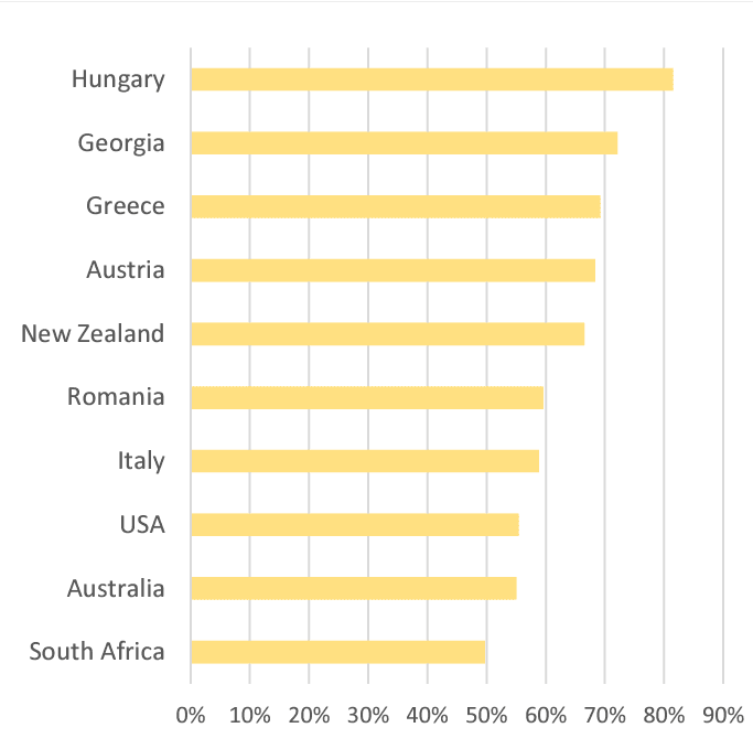 Se os argentinos viram o interesse por vinhos brancos despencar e perder participação, alguns países evidenciaram o inverso. Nestes casos, os vinhos brancos respondem por uma elevada proporção do consumo total de vinhos. Ao contrário do que poderia se esperar, porém, estas proporções parecem não refletir, necessariamente, as condições climáticas. A Hungria, por exemplo, aparece como o país com maior consumo relativo de vinhos brancos, que respondem por 82% do total.