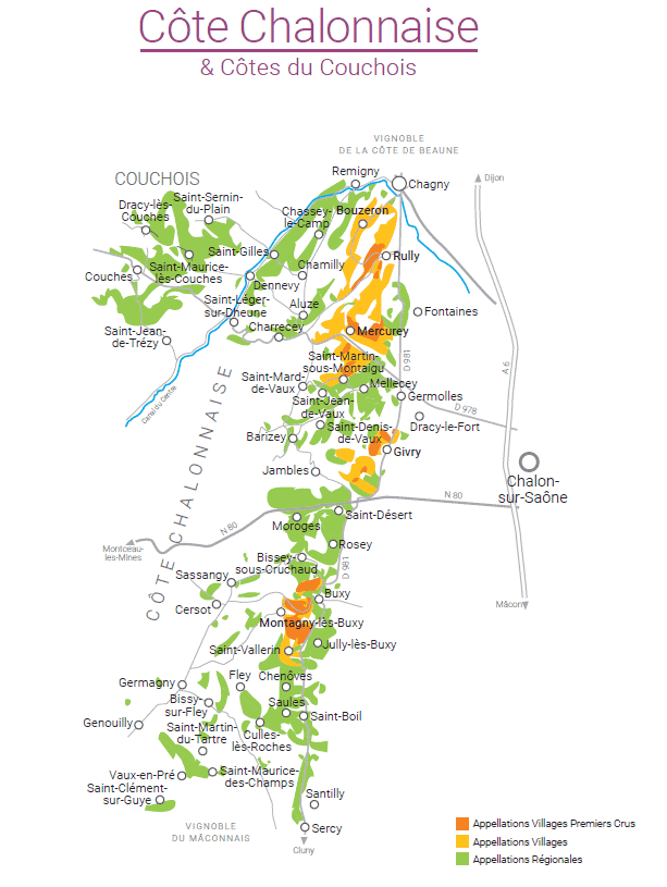 É uma região que produz tanto vinhos tintos como brancos, em uma proporção praticamente equivalente, quando se leva em conta as denominações Villages. Porém, existem diferenças significativas entre suas cinco principais denominações de origem. Duas se dedicam exclusivamente a vinhos brancos: Bouzeron (a única denominação da Borgonha com foco total na Aligoté) e Montagny (Chardonnay).