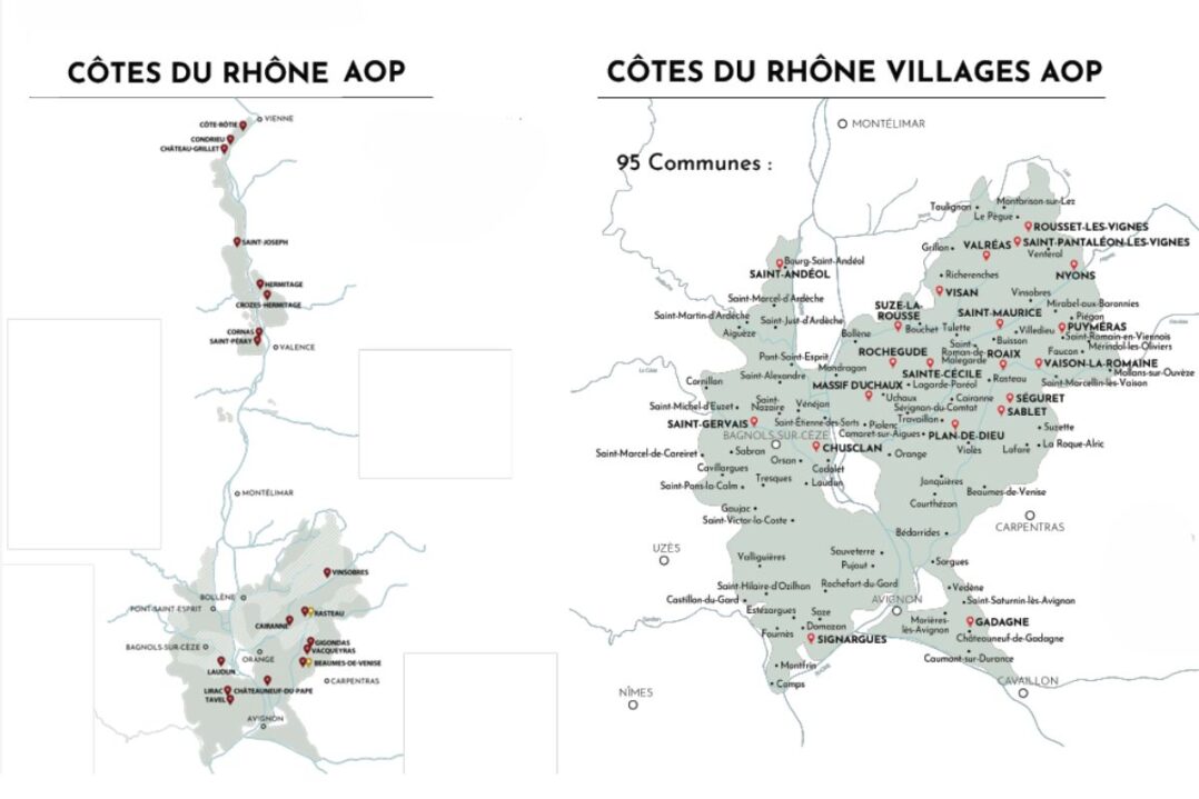 Côtes du Rhône estende-se por um amplo território, englobando os Rhône Norte e Sul. A denominação abrange vários departamentos e abriga uma grande diversidade de solos e exposições. Já a Côtes du Rhône Villages está restrita ao Rhône Sul (a parte inferior do primeiro mapa abaixo), abrangendo 95 comunas distribuídas entre Ardèche, Drôme, Gard e Vaucluse.