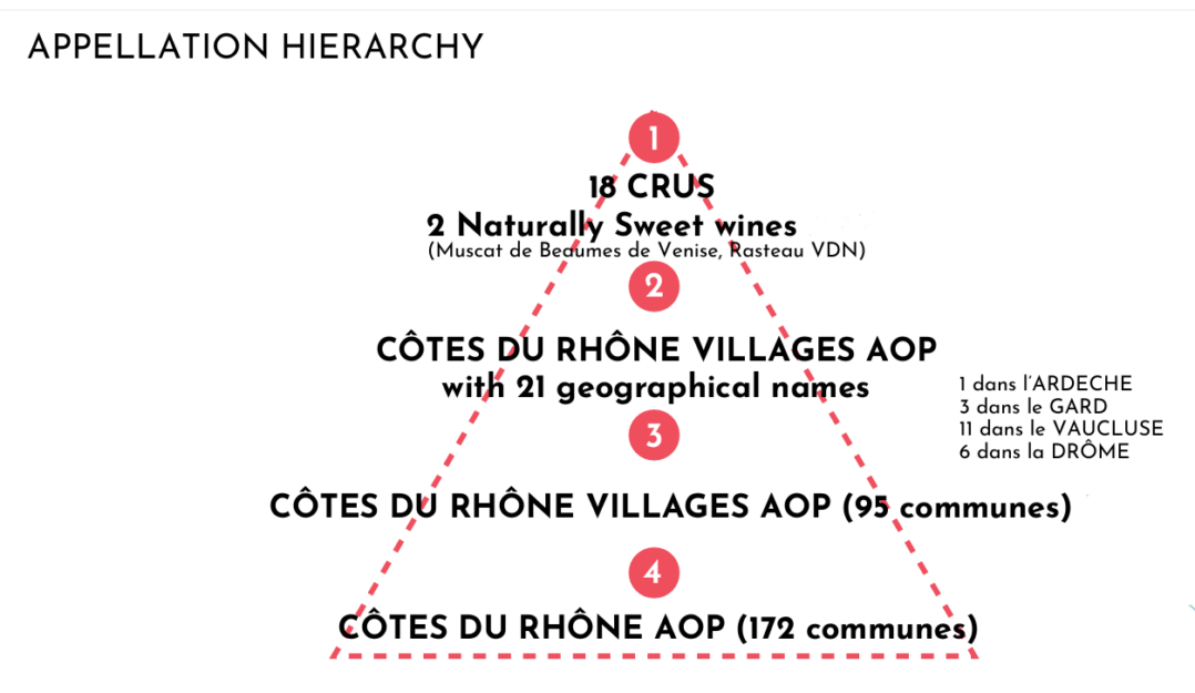 Vale lembrar que há áreas no Vale do Rhône que, tecnicamente, não se qualificam como parte desta “pirâmide”. Exemplos incluem Ventoux, Luberon e Costières de Nîmes, entre outros. Caso estas áreas não fossem consideradas, a proporção de Côtes du Rhône e Côtes du Rhône Villages superaria 75% dos vinhos que integram a “pirâmide”. Deste modo, analisar em detalhes destas duas denominações de origem é fundamental.