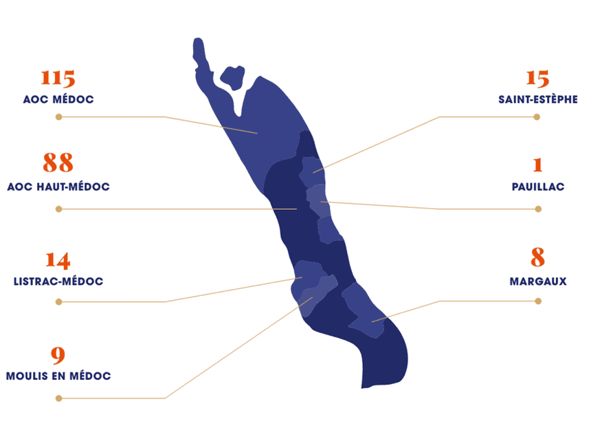A figura abaixo apresenta as áreas de produção dos Cru Bourgeois, todas elas localizadas ao norte de Bordeaux, no Haut-Medoc e Medoc, regiões vinícolas ao norte da cidade de Bordeaux.