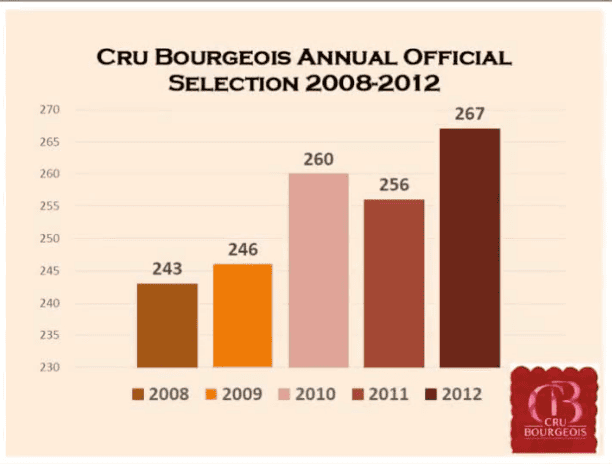 A figura acima ilustra a evolução do número de vinhos aprovados. Essa avaliação anual criou uma tremenda confusão na cabeça do consumidor. Afinal, um vinho pode perder o status de Cru Bourgeois de um ano para o outra. Para corrigir isso, uma nova alteração foi feita em 2018, que está em vigor. A partir de 2020, a classificação da safra de dois anos anteriores (portanto a de 2018) valerá até 2025, quando será novamente reavaliada.