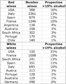 Em sua pesquisa, considerou dados para 14.187 vinhos (em 26 de julho de 2023), com 6.375 tintos e 3.960 brancos (incluindo todos os vinhos, independentemente do tipo ou tamanho do recipiente). No entanto, somente nove países tinham mais de 100 vinhos disponíveis para comparação. Com estes números em mãos, ele calculou a proporção de vinhos com mais de 15% de álcool (tintos) e 14% (brancos), para cada país.