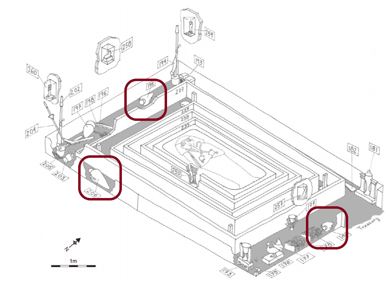Além dos vinhos presentes na câmara anexa, que funcionaria como uma dispensa, o que mais chamou a atenção dos arqueólogos foi a presença de vinhos também na câmara principal. No espaço onde estava o sarcófago do faraó, foram encontrados mais três recipientes com vinho, entre a parte externa do sarcófago e as paredes situadas a leste, oeste e sul.