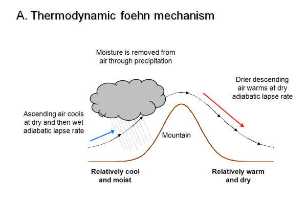 O primeiro fenômeno é a condensação e precipitação. Quando o ar é forçado para cima em terreno elevado, ele se expande e esfria devido à diminuição da pressão decorrente da maior altitude. Como o ar mais frio retem menos vapor, a umidade se condensa para formar nuvens e precipita como chuva ou neve, geralmente acima das encostas a barlavento. A mudança de estado de vapor para água líquida é acompanhada por aquecimento e a subsequente remoção de umidade. À medida que a precipitação torna esse ganho de calor irreversível, isso leva às condições quentes e secas do Foehn a sotavento da montanha. Isso é o que está descrito na figura acima.