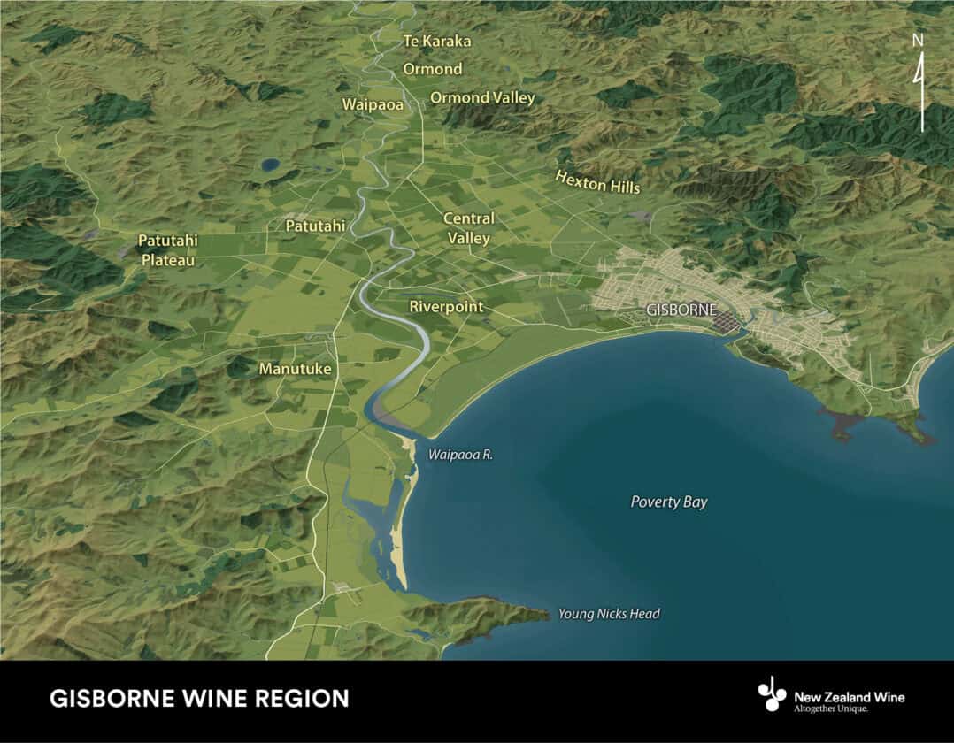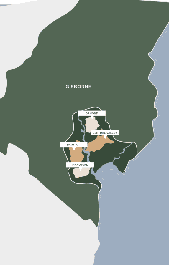 Com vinhedos se estendendo ao interior a partir da Poverty Bay, Gisborne possui diversos distritos vinícolas, que podem ser agrupados em quatro sub-regiões. Destas, três se distinguem: Ormond, Patutahi e Manutuke. Situada ao norte da cidade, onde o vale do rio se estreita nas cordilheiras de Raukumara, Ormond conta com os primeiros vinhedos cultivados na região, produzindo diversos vinhos de vinhedos único. Esta área também abriga The Golden Slope, uma escarpa de 10 km com solo superficial de calcário e que produz alguns dos melhores Chardonnay de Gisborne.