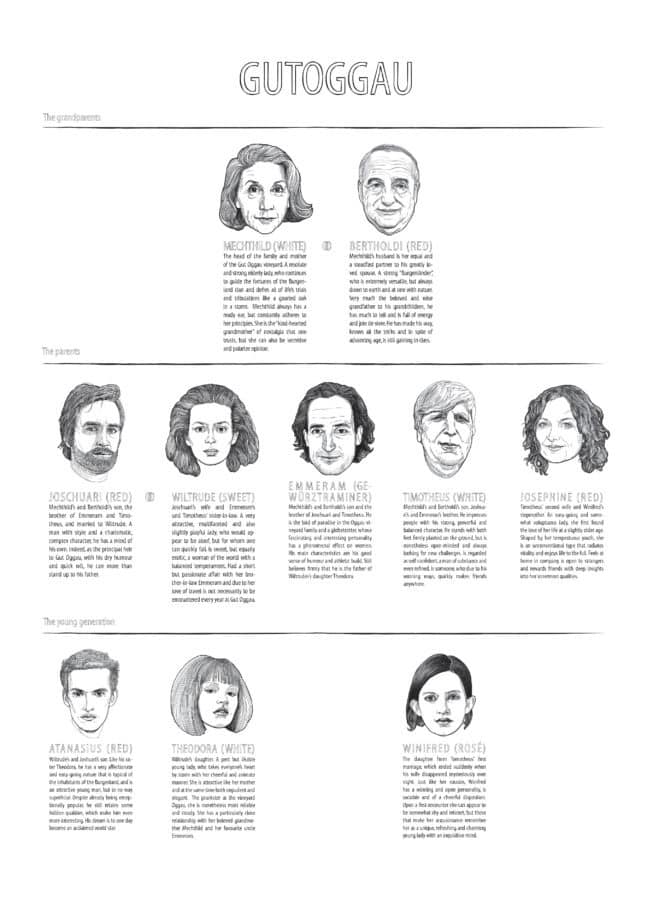 E toda família tem uma árvore genealógica. Os mais velhos e tradicionais são Mechtild e Bertholdi, dois vinhos produzidos a partir de vinhedos únicos de videiras mais antigas. A segunda geração é composta por Joschuari, Emmeram, Timotheus e Josephine, que vêm de vinhedos de exposição direta ao sol, produzindo vinhos com bom corpo e poder. Por fim, os mais jovens são os netos Atanasius, Theodora e Winifred, vinhos mais leves, ousados e cheios de energia.