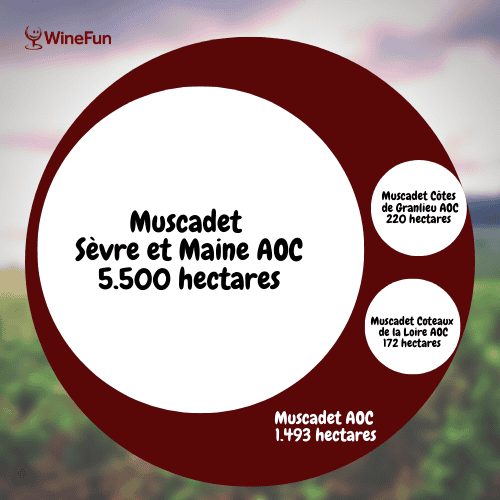 Apesar de se estender por uma região mais ampla, a denominação de origem Muscadet AOC não é a maior em termos de área de vinhedos. Como pode ser visto no diagrama abaixo, uma proporção elevada dos vinhedos dentro de sua área geográfica faz parte da Muscadet Sèvre et Maine AOC. Assim, com cerca de 1,500 hectares de vinhedos (a área cor de vinho no diagrama), ela inclui os vinhedos que não fazem parte das outras três. A produção anual média fica na faixa 85.200 hectolitros, o equivalente a 11,54 milhões de garrafas/ano.