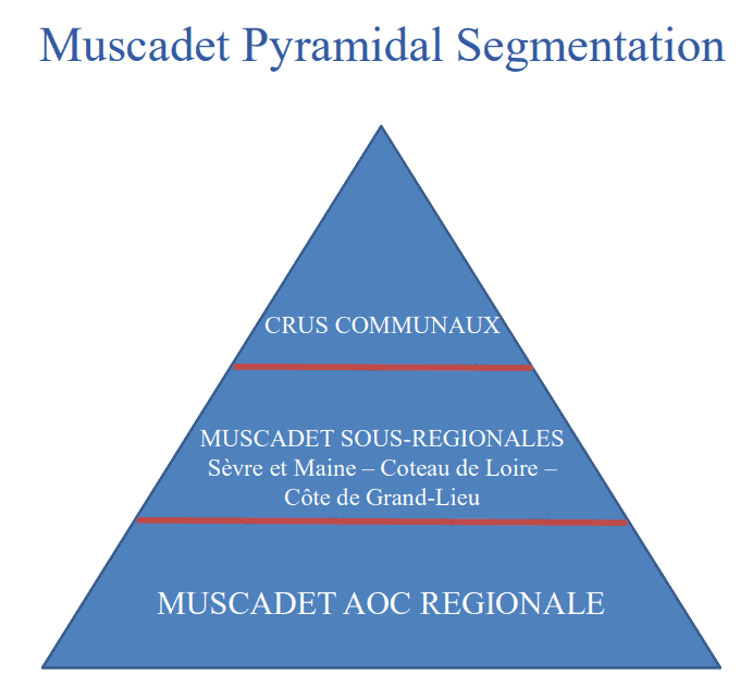 Uma delas, Muscadet AOC, funciona como a base da pirâmide e também como uma espécie de guarda-chuva, se estendendo por uma área mais ampla. Já as outras três (Muscadet Coteaux de la Loire AOC, Muscadet Côtes de Grandlieu AOC e a já citada Muscadet Sèvre et Maine AOC) são sub-regiões dentro da Muscadet AOC, porém funcionam como denominações com identidades e regras próprias. Os Crus Communaux, por sua vez, não são denominações de origem, mas sim áreas dentro da Muscadet Sèvre et Maine AOC valorizadas pela presença de vinhedos mais homogêneos e de melhor qualidade.