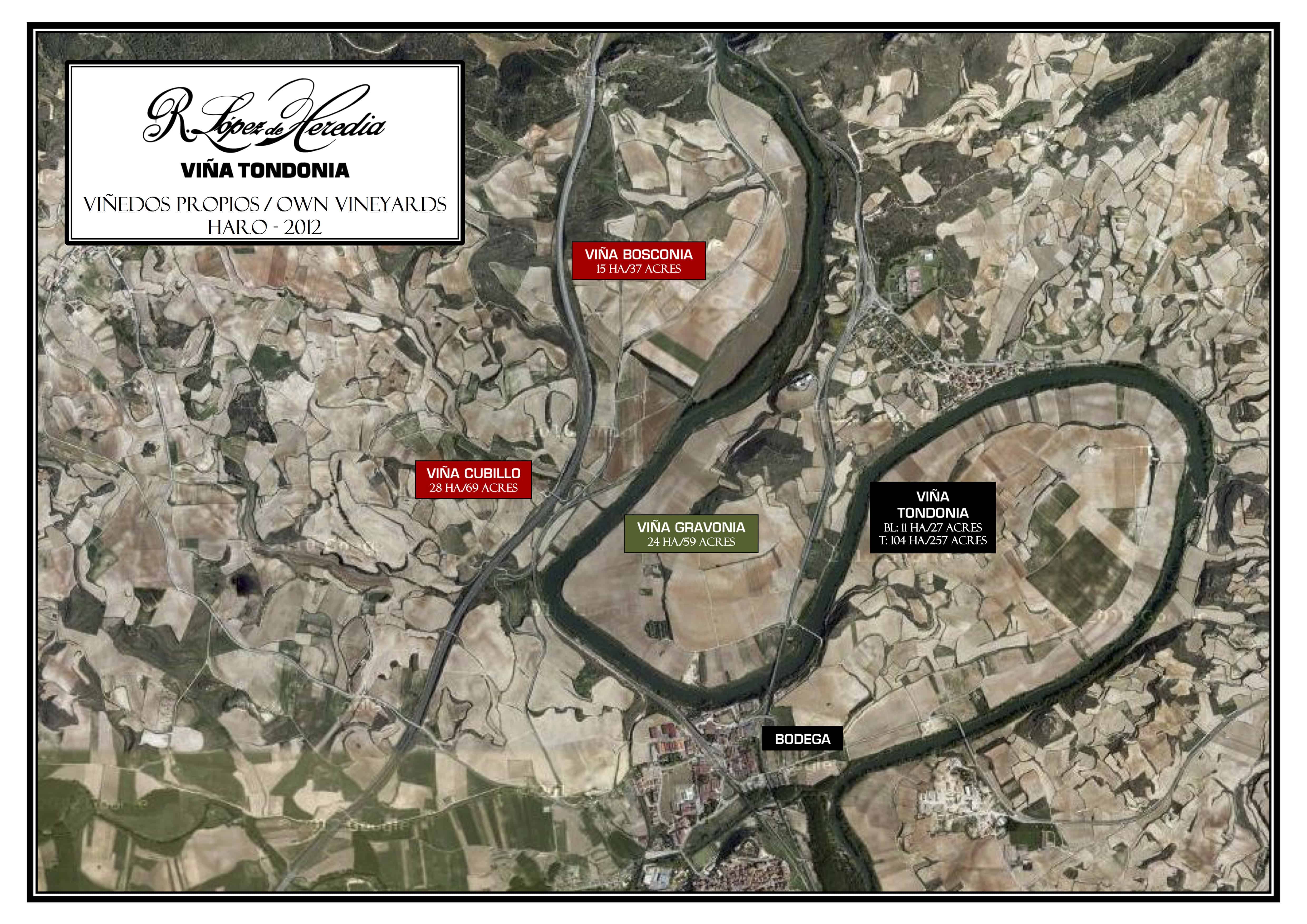 Seu principal vinhedo, Viña Tondonia, dá nome a alguns de seus vinhos mais conhecidos e tem mais de 100 hectares no banco direito de rio Ebro. Além dele, são mais três vinhedos distintos, que dão nomes aos outros vinhos produzidos pela López de Heredia: Viña Cubillo, Viña Bosconia and Viña Gravonia.