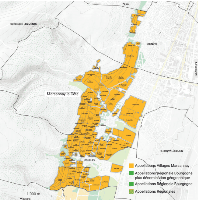 A denominação de origem Marsannay se estende por três communes diferentes: Marsannay-la-Côte, Couchey e Chenôve. No total, a área demarcadada atinge cerca de 380 hectares, com aproximadamente 226 hectares de vinhedos. Chenôve é praticamente um subúrbio de Dijon, enquanto Marsannay-la-Côte concentra a maioria dos vinhedos, deixando um papel secundário para Couchey.