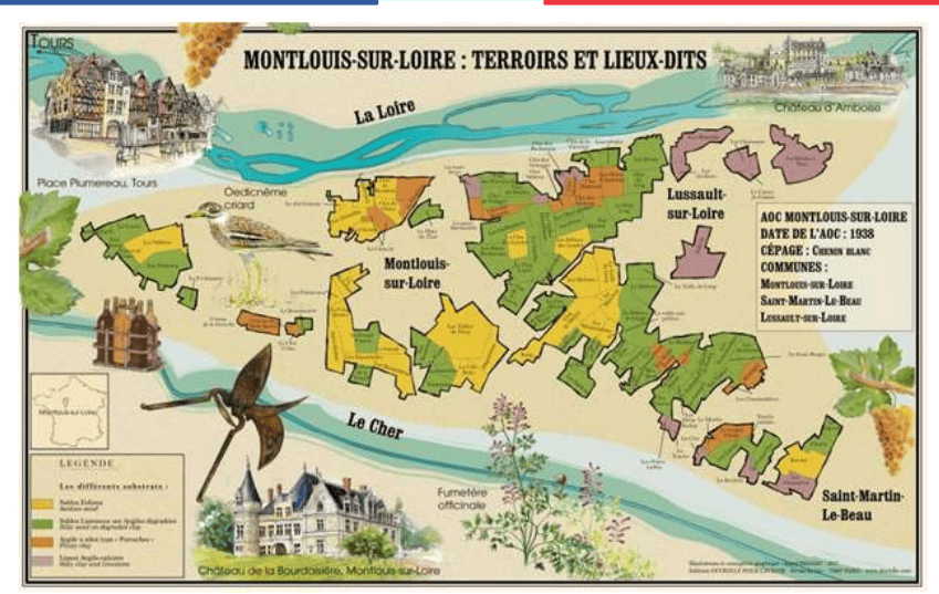 Fontes: Loire Master Level Study Manual, Wine Scholar Guild; The Wine Doctor; Cahier des Charges de L’appellation d’origine Montlouis-sur-Loire; Loire Valley Wine Economic Report, Decanter; Loire Valley Wine Tour; Vins Montoluis-sur-Loire; Dossier de Presse AOC Montlouis-sur-Loire; Cartographie et caractérisation des terroirs viticoles Vignoble de Montlouis-sur-Loire
