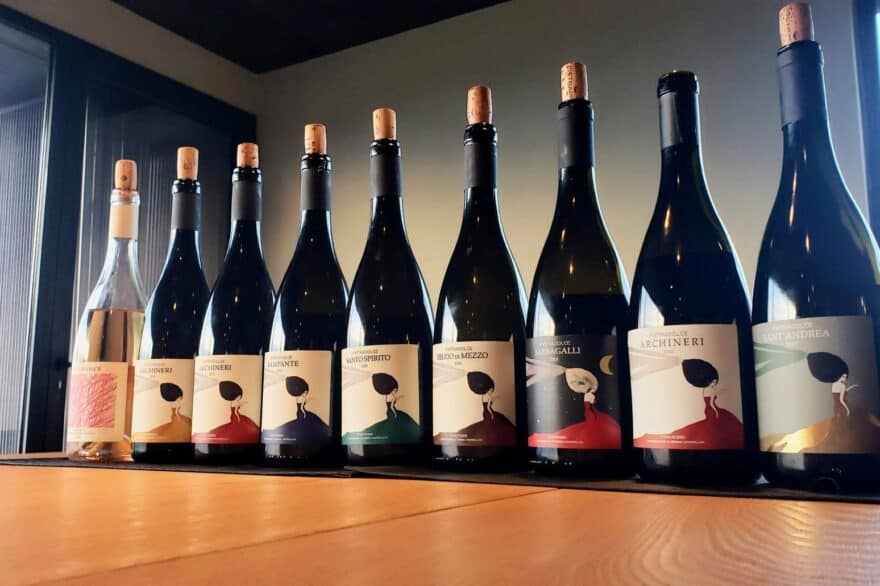 A degustação começou com o Rosato 2022, elaborado a partir de vinhas de Nerello Mascalese de 40 anos, com maceração de apenas três horas. Um vinho fresco, leve e salino, um excelente ponto de partida. A seguir veio o Archineri Bianco 2021, elaborado a partir de vinhas velhas de Carricante provenientes da Contrada Caselle, em Milo, um dos melhores terroirs para vinhos brancos no Etna.