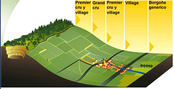 Mesmo na Borgonha, o verdadeiro berço da Pinot Noir (perdoem-me os alemães), transformações importantes já estão em curso. Tradicionalmente, os vinhedos da região eram classificados de acordo com a posição nas encostas, conforme demonstrado na figura abaixo: