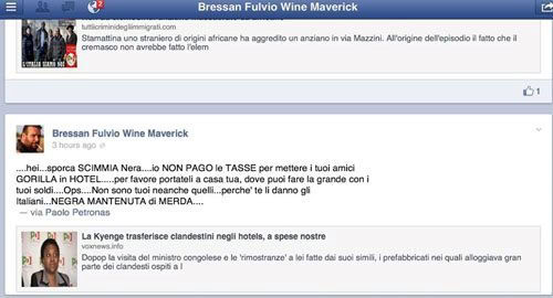 “Ei… Imunda macaca preta… Eu NÃO PAGO impostos para colocar seus amigos GORILAS em um HOTEL… Por favor, leve-os para sua casa onde você pode usar o seu dinheito … Ops! Esse dinheiro nem é seu… porque os italianos dão a você… VOCÊ PRETA SUSTENTADA DE M…”