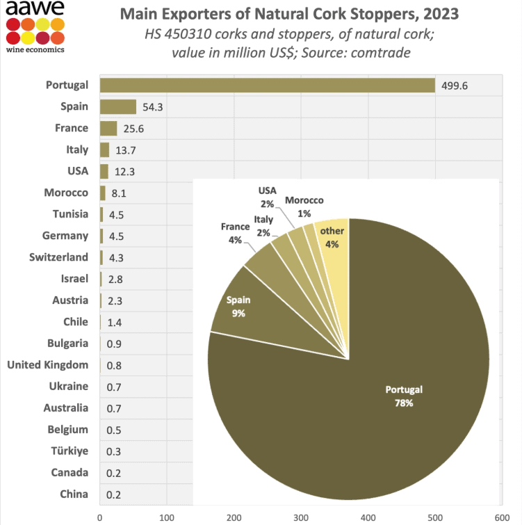 Com exportações de quase US$ 500 milhões em 2023, Portugal foi responsável por 78% das exportações globais de rolhas naturais. Em um distante segundo lugar ficou a Espanha, com 9% do mercado, seguida por França, Itália e Estados Unidos. E mesmo em Portugal, um nome domina: se no mundo 13 bilhões de garrafas tinham rolhas naturais em 2023, a Corticeira Amorim, sediada em Mozelos (não muito distante do Porto) vendeu 6,1 bilhões.