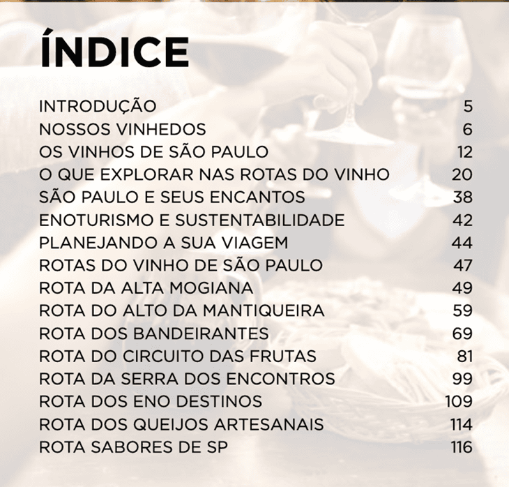 Seu conteúdo explora não apenas os aspectos relacionados ao vinho da região, mas também sugere roteiros de visita, com endereços de vinícolas e, o que é bastante positivo, busca uma conexão com outros temas, como a rota dos queijos artesanais, hotéis e outras atrações locais. Contém uma pequena introdução sobre a viticultura paulista, citando as variedades de uvas cultivadas e os diferentes estilos de vinho.