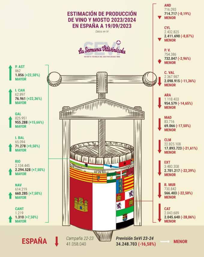 A drástica mudança nas projeções se relaciona com as novas previsões da safra na região de Castilla-La Mancha. Responsável por cerca de 50% da produção total espanhola, suas projeções passaram a ser muito mais pessimistas. No início de agosto, a estimativa da safra 2023 nesta região era de 20 milhões de hectolitros, 12% a menos que no ano passado.