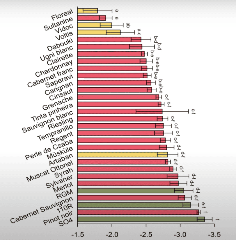 No grupo intermediário, diversas uvas de grande produção e alta reputação, como Carignan, Cinsault, Grenache, Sauvignon Blanc, Riesling e Tempranillo. Por fim, o grupo de variedades mais resistentes inclui Syrah, Sylvaner, Merlot, Cabernet Sauvignon e uma grande surpresa positiva. Apesar de ser considerada uma variedade de cultivo difícil, a Pinot Noir se mostrou a segunda uva mais resistente à seca, somente atrás da SO4, variedade americana usada como porta-enxerto.