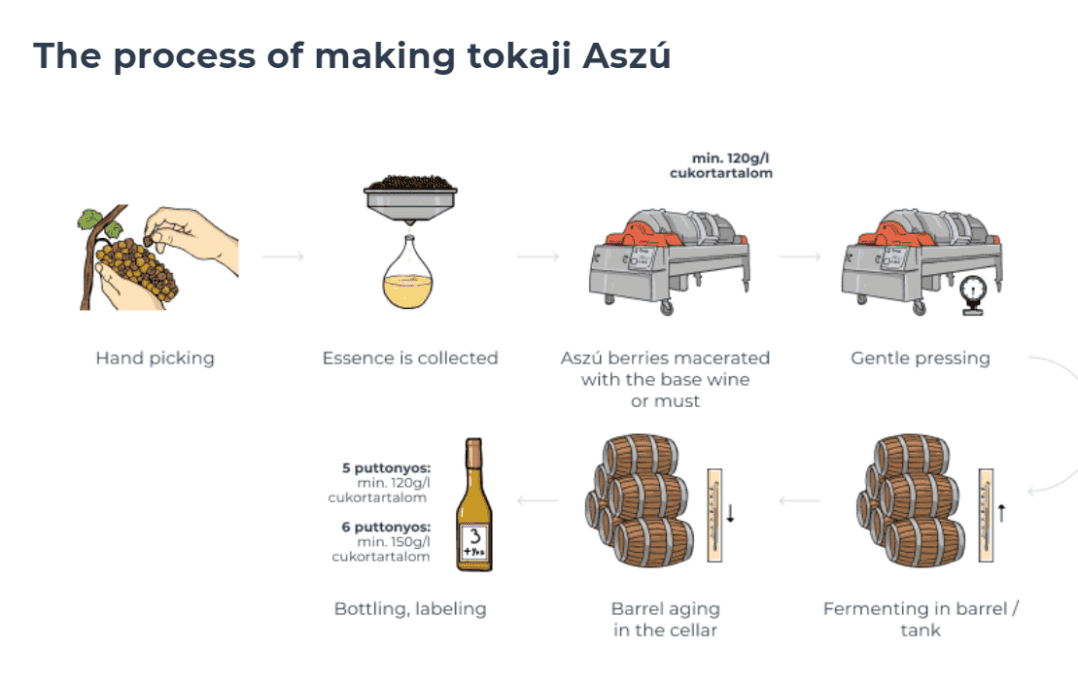 O processo tradicional é relativamente simples. Puttonyos são pequenos baldes de 20 quilos de uvas botritizadas, que eram adicionadas a um barril de 136 litros, até hoje chamados de Gönci. Por exemplo, caso houvesse adição de três baldes de uvas Aszú, o vinho é um 3 Puttonoyos. Quando falamos em vinhos Aszú, são cinco possibilidades distintas, conforme a tabela abaixo. Atualmente, a definição se dá por grau de açúcar residual, com a fermentação podendo ocorrer em diversos recipientes de carvalho ou mesmo em aço inoxidável.