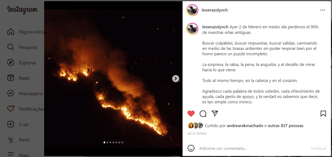 Em sua conta no Instagram, Leonardo Erazo, que além de atuar como enólogo na vinícola argentina Alto las Hormigas, desenvolve projetos no Valle del Itata, como A Los Viñateros Bravos e Rogue Vines, dá uma dimensão da tragédia. Ele relatou que em 2 de fevereiro perdeu 90% de suas vinhas velhas da área de Guarilihue, por conta do incêndio.