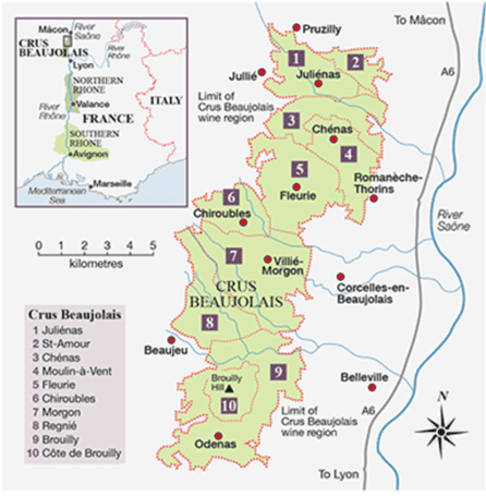 Já os Crus de Beaujolais são dez AOC, correspondente a 10 vilarejos, ou zonas de produção, cujos vinhos devem ser elaborados apenas com uvas cultivadas na área delimitada. A figura abaixo, extraída da edição de março de 2015 da Decanter Magazine, apresenta a área dessas dez apelações, todas elas localizadas na parte norte da região.