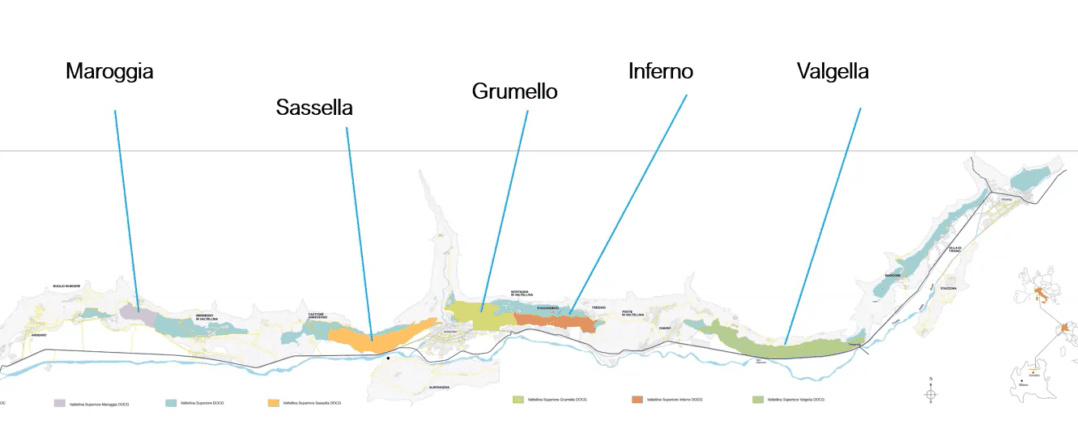 Dentro desta denominação, os vinhos produzidos podem trazer referências a cinco subzonas: Maroggia, Sassella, Grumello, Inferno e Valgella. Destas, a mais conhecida é Sassella, a segunda maior em área plantada (117 hectares, contra 136 hectares de Valgella), porém a de maior produção. Com uma média de 610 mil garrafas ao ano, ela sozinha representa cerca de 34% do total das cinco subzonas.
