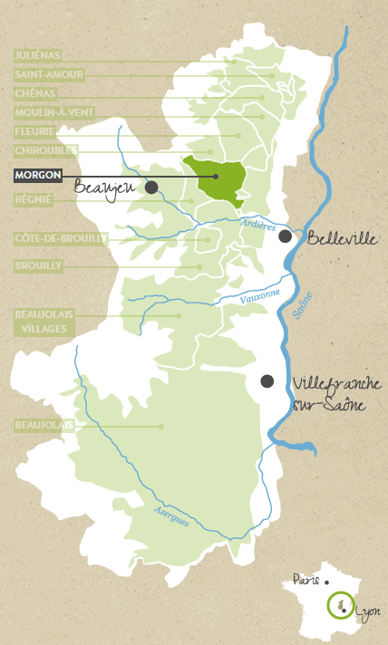 Villié-Morgon, o principal vilarejo da denominação Morgon, fica na parte norte do Beaujolais, cerca de 20 quilômetros ao sul de Mâcon, na Borgonha, e aproximadamente 45 quilômetros ao norte de Lyon. A denominação Morgon conta com cerca de 1.100 hectares de vinhedos, o que a coloca como o segundo maior Cru de Beaujolais, somente atrás de Brouilly.