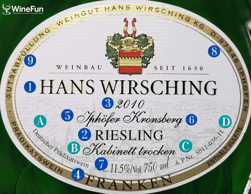 Esta é uma informação obrigatória, aliás não somente na Alemanha. Neste caso, estamos nos referindo à vinícola Hans Wirsching, que também informa no rótulo (informação não obrigatória), que atua na viticultura desde 1630. Embora não seja o caso na parte principal deste rótulo, é muito comum na Alemanha um termo antes do nome, assim como Château na França. Os mais comuns são Kloster, Schloss, Burg, Domaine ou Weingut.