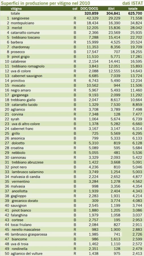 Quando a área plantada inclui somente as videiras dentro de denominações de origem (seja ela DOC ou DOCG), o quadro geral muda pouco, mas com algumas alterações interessantes. Por exemplo, a Catarratto, usada sobretudo para vinhos considerados mais simples, praticamente desaparece da lista de uvas mais plantadas, caindo para a 27ª posição. O mesmo acontece com a Merlot, no caso por ser uma uva francesa e que conta de sua presença maior em vinhedos IGT.
