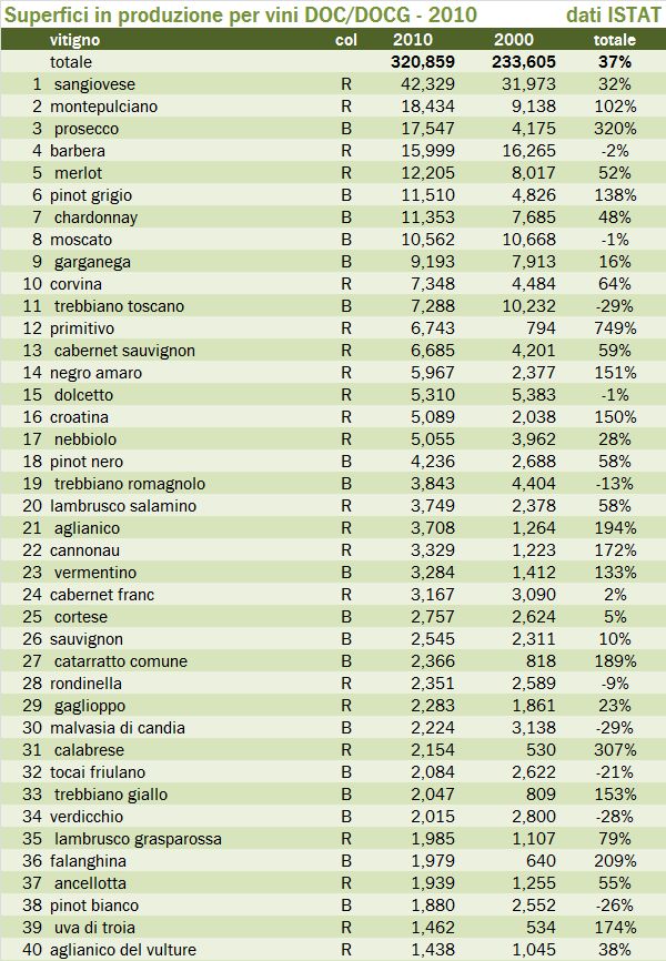 Apesar disso, algumas variedades ganham grande destaque nos vinhedos italianos. A uva mais plantada em 2010 era a Sangiovese, com cerca de 71,5 mil hectares. Isso correspondia a pouco mais de 11% da área plantada com videiras no Belpaese. Possivelmente a variedade mais internacionalizada entre as uvas tintas italianas, ela vem ganhando também mais destaque em seu país de origem, com sua área crescendo cerca de 2,6% entre 2000 e 2010.